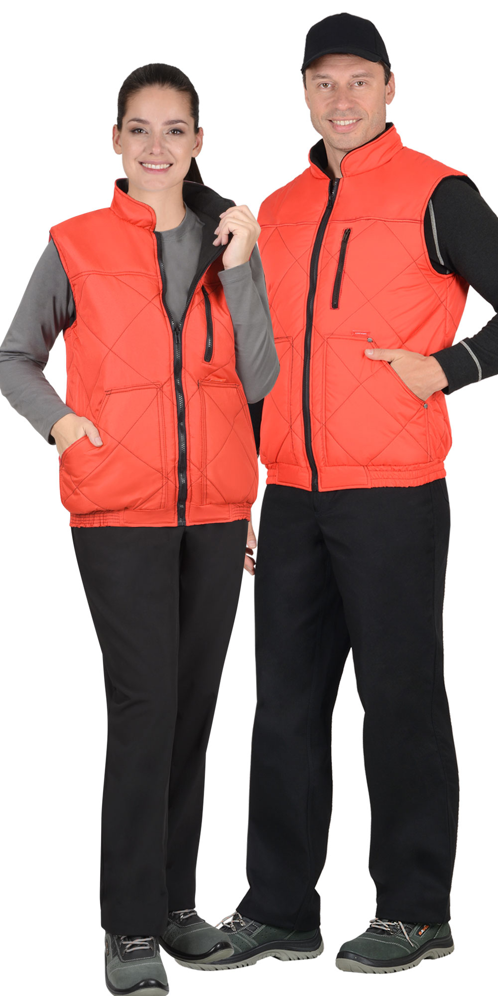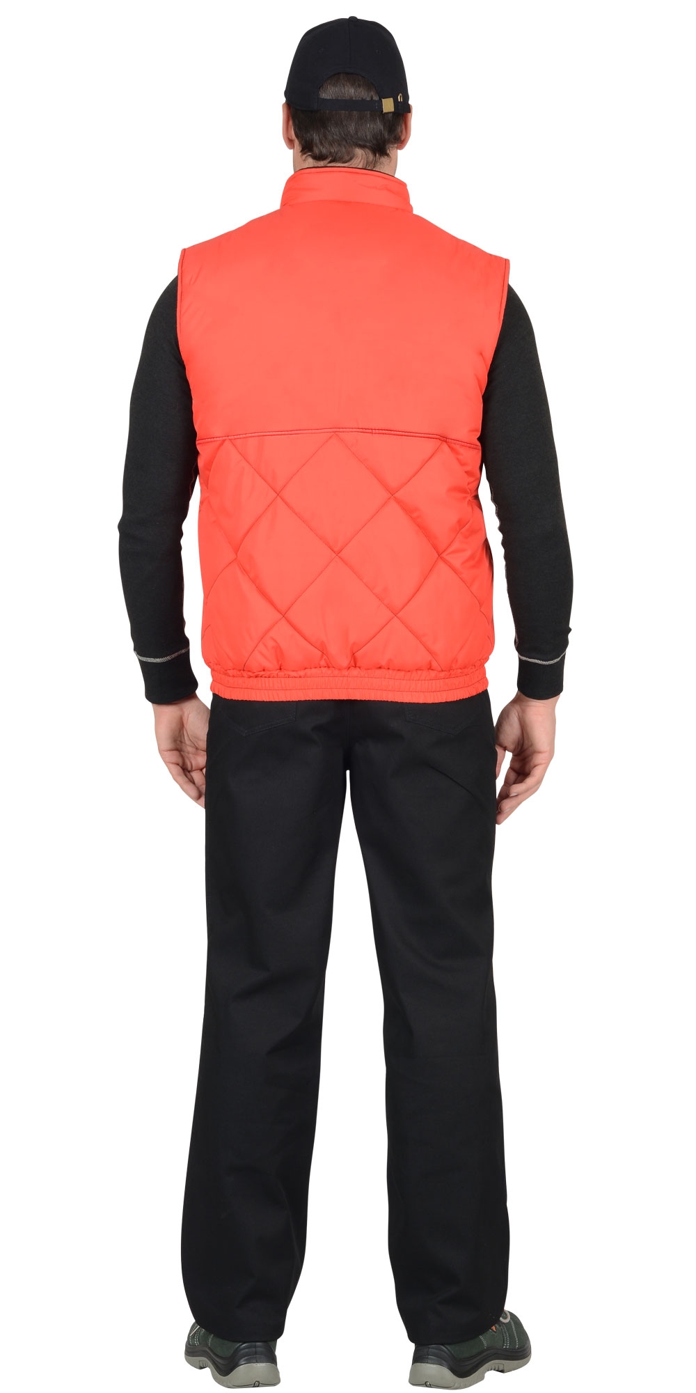 Жилет утеплённый, стёганый в виде ромбов, прямого силуэта, с застёжкой на молнию, с воротником стойка, подкладка жилета и внутренний воротник из флиса контрастного цвета. Полочки и спинка с отрезными кокетками без стёжки для возможности нанесения логотипа. Жилет с одним нагрудным карманом с молнией, двумя большими накладными нижними карманами с наклонным входом и внутренним накладным карманом на подкладке с правой стороны. По низу жилет с поясом, собранным на резинку.