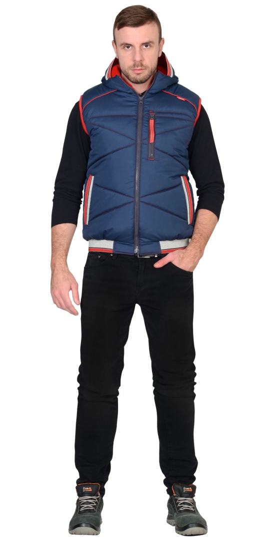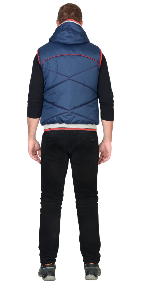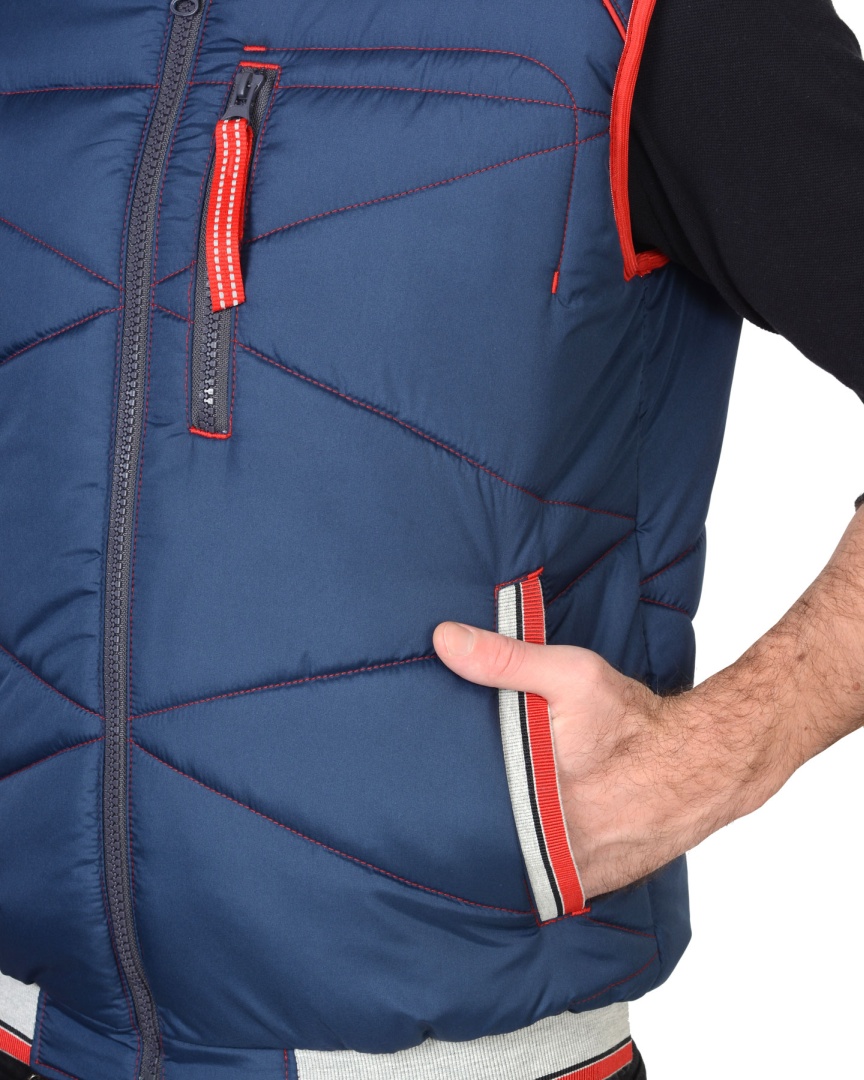 Жилет утепленный, с притачным капюшоном, с центральной застежкой на тесьму-«молния», полочка с двумя нижними и одним верхним карманами. Верхний карман с вертикальным входом на «молнии», нижние карманы с листочкой из декоративной резинки. Пояс притачной на резинке.Ткань верха: «Дюспо», состав: 100% п/э, пл. 75 г/ м2Ткань подкладочная: «Флис», 100% п/э, пл. 180 г/м2 Ткань подкладочная2: «Тафета», состав: 100 п/э. пл.75 г/м2, Утеплитель: «Синтепон», состав: 100%п/э, пл. 150 г/м2.Спинка, полочка — 300 г/м2 (2 слоя).Нижняя часть капюшона — 150 г/м2 (1 слой).